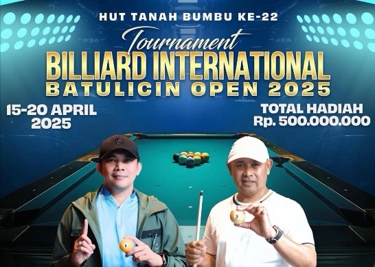 Turnamen internasional Batulicin Open 2025 dijadwalkan digelar pada 15-20 April 2025 di Gimme Billiards dengan total hadiah mencapai Rp 500 juta. Gimme Billiards berlokasi di Gimme Cafe, Jalan Kuranji, Kecamatan Simpang Empat.
