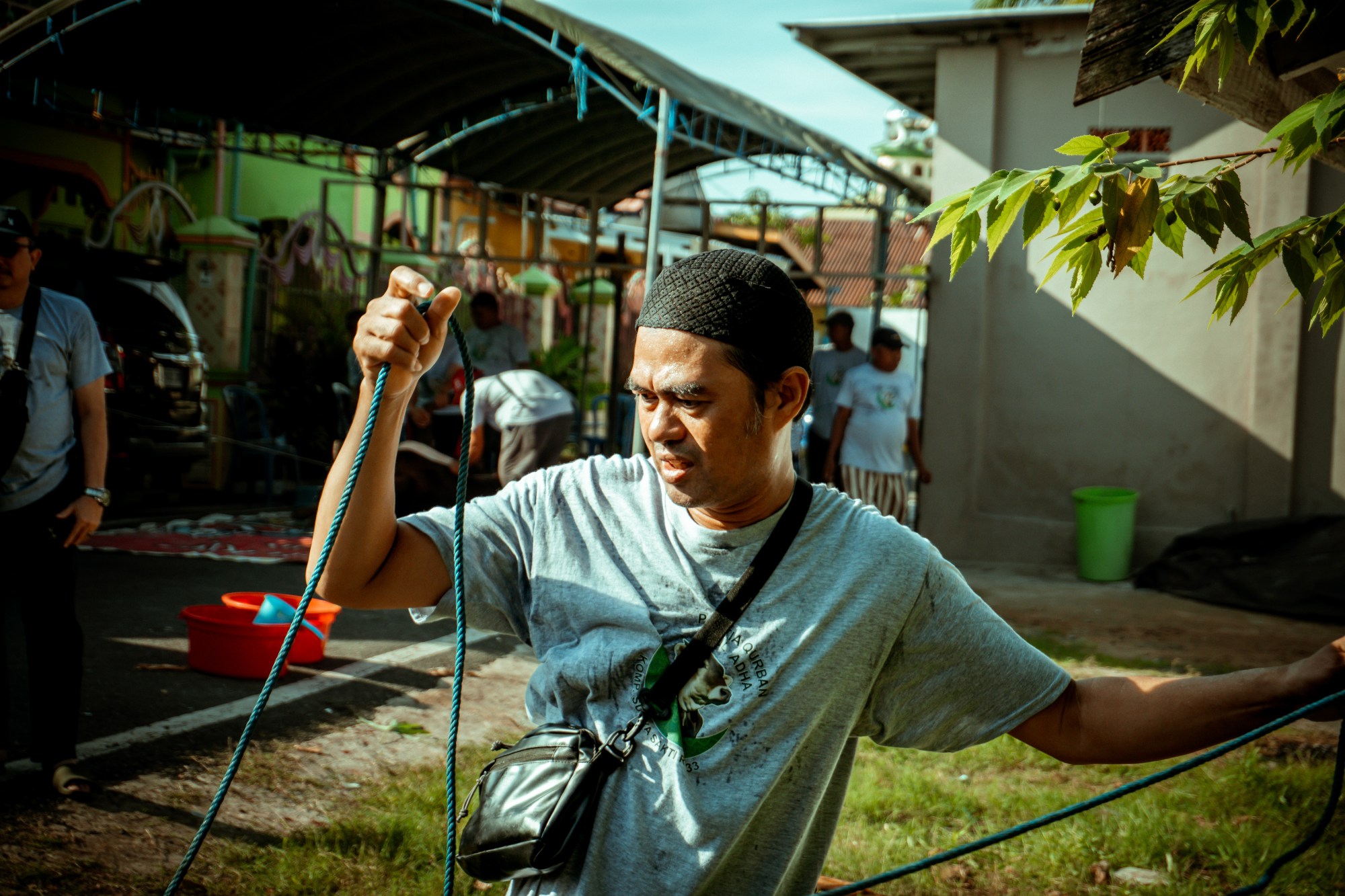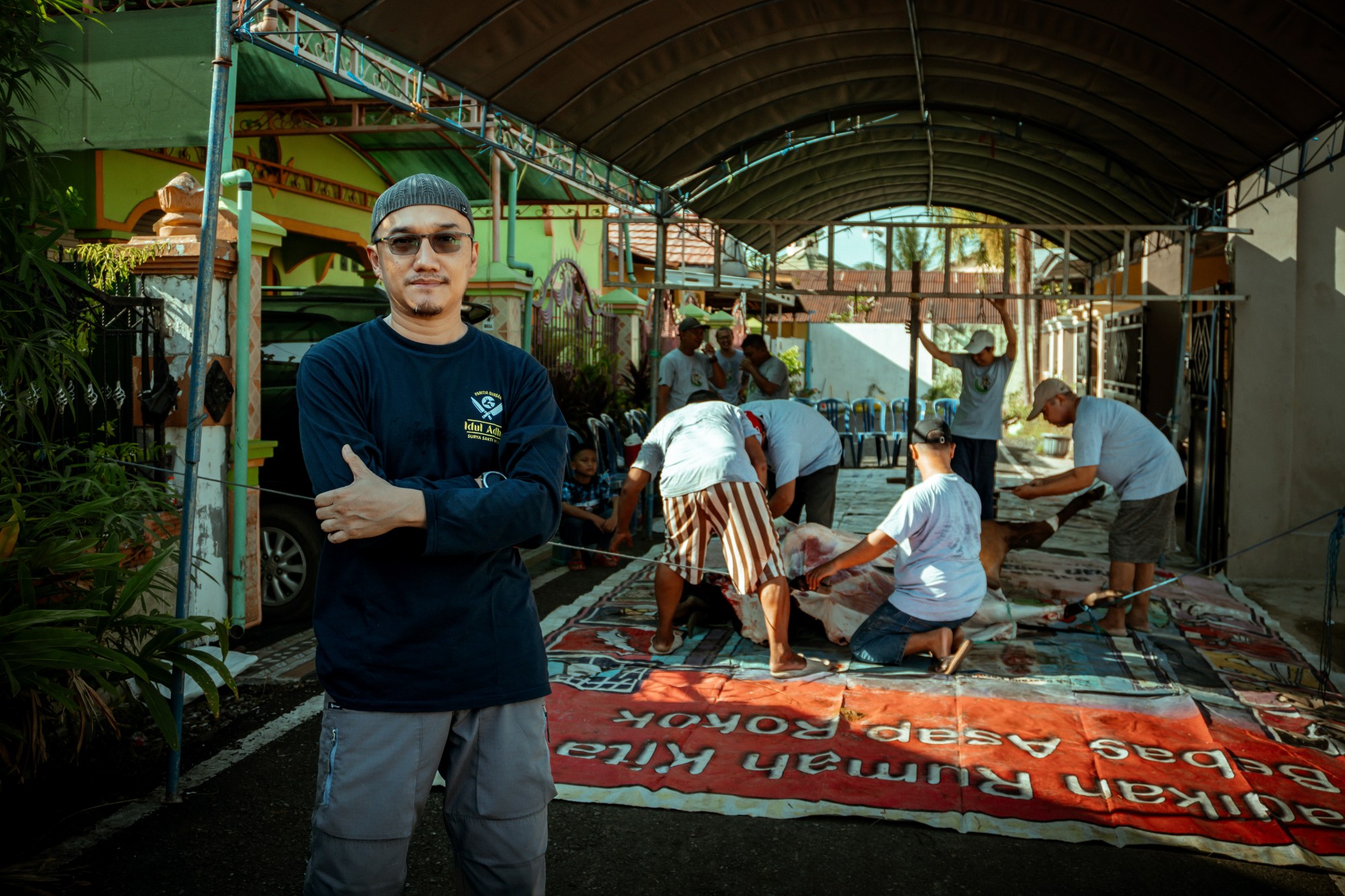 Yang gak kalah menarik, momen penuh semangat ini juga diabadikan dalam satu jepretan yang powerful banget. Sebuah foto dokumenter yang terasa hidup—penuh energi, rasa, dan cerita. Karya ini dipotret oleh Atif Almirza Kadafi, seniman visual digital yang namanya cukup dikenal di Bumi Bersujud. Atif bukan nama baru—ia sudah melanglang buana dari Papua hingga Afrika, dan kali ini meng-capture momen qurban di RT 33 dengan gaya visual yang cinematic meets real life. Rasanya kayak ngelihat still image dari film dokumenter kelas festival.