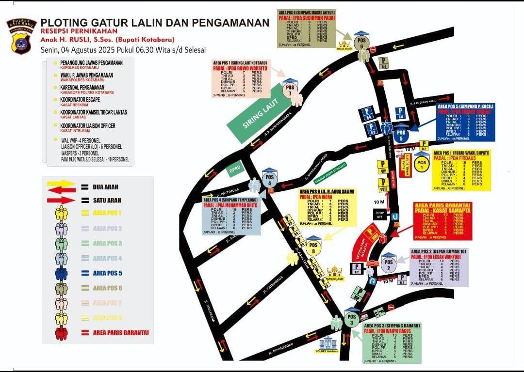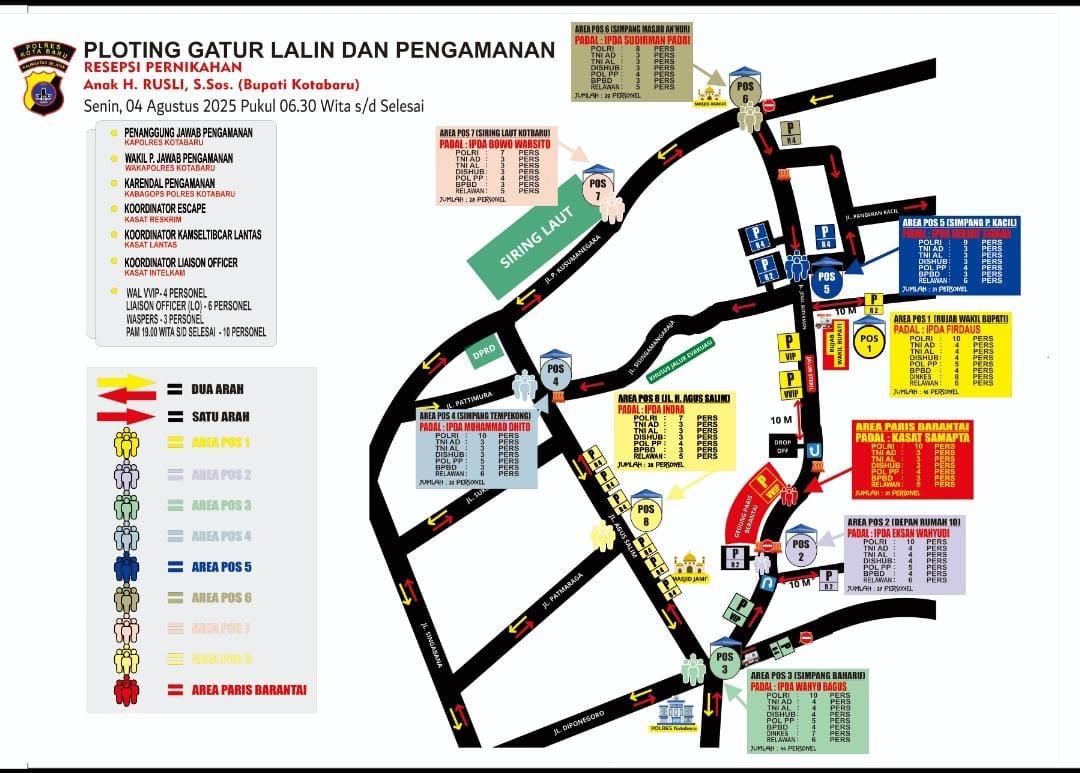 HayKalsel, Kotabaru – Sebanyak 306 personel gabungan dikerahkan untuk mengamankan resepsi pernikahan putra ketiga Bupati Kotabaru H. Muhammad Rusli yang digelar pada Senin (4/8/2025). Pengamanan difokuskan pada pengaturan lalu lintas dan kelancaran mobilitas tamu undangan.