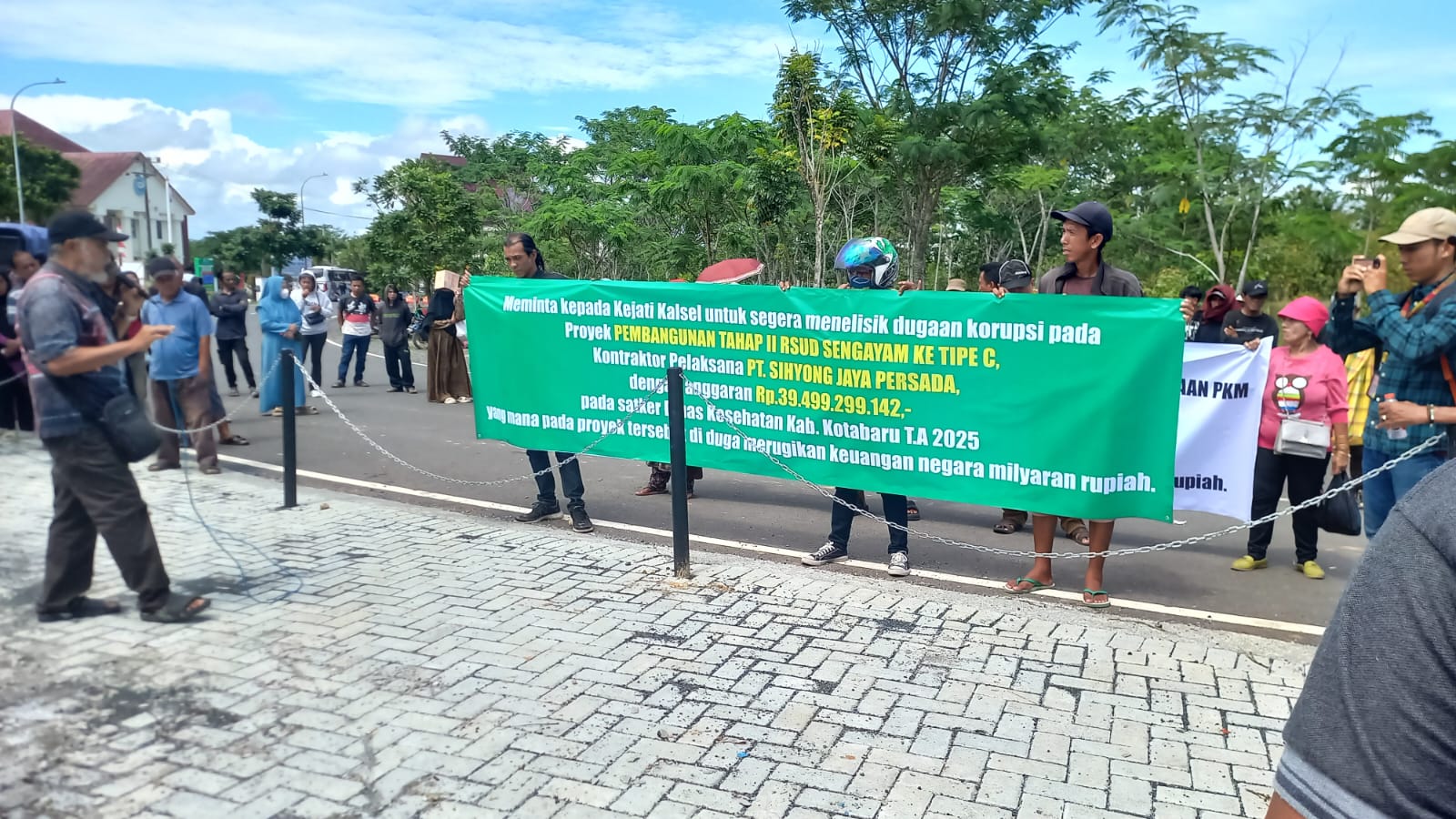 HayKalsel, Kotabaru – Sejumlah warga menggelar aksi damai dengan membentangkan spanduk berisi tuntutan agar Kejaksaan Tinggi (Kejati) Kalimantan Selatan segera menyelidiki dugaan korupsi pada proyek pembangunan tahap II RSUD Sengayam yang ditingkatkan menjadi Tipe C.