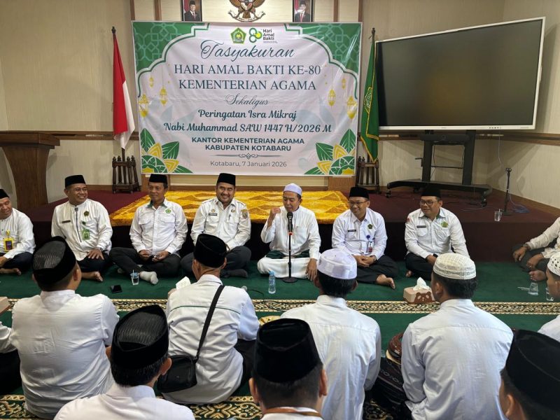 Kotabaru – Kantor Kementerian Agama Kabupaten Kotabaru menggelar tasyakuran dalam rangka memperingati Hari Amal Bhakti ke-80 Kementerian Agama yang dirangkaikan dengan peringatan Isra Mi’raj Nabi Muhammad SAW 1447 Hijriah/2026 Masehi, Rabu (7/1/2026). Kegiatan tersebut berlangsung di Kantor Kemenag Kabupaten Kotabaru.