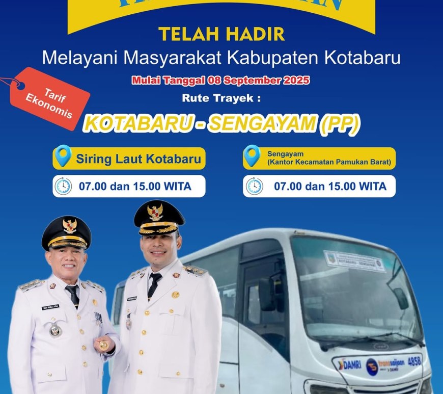 HayKalsel, Kotabaru – Warga Kabupaten Kotabaru kini bisa menikmati layanan transportasi publik baru dengan hadirnya Trans Saijaan yang resmi beroperasi mulai Senin, 8 September 2025. Program ini digagas oleh Dinas Perhubungan (Dishub) Kotabaru bekerja sama dengan DAMRI sebagai upaya meningkatkan konektivitas antarwilayah dan memudahkan mobilitas masyarakat. Trans Saijaan melayani rute Kotabaru–Sengayam (PP) dengan titik keberangkatan di Siring Laut Kotabaru dan Kantor Kecamatan Pamukan Barat, Sengayam. … Continue reading Trans Saijaan Resmi Beroperasi, Warga Kotabaru Kini Punya Pilihan Transportasi Umum Baru
